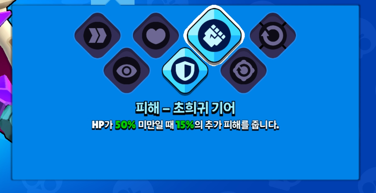 | 피해 (코인: 1000) | HP가 50% 미만일 때 15%의 추가 피해를 줍니다. |